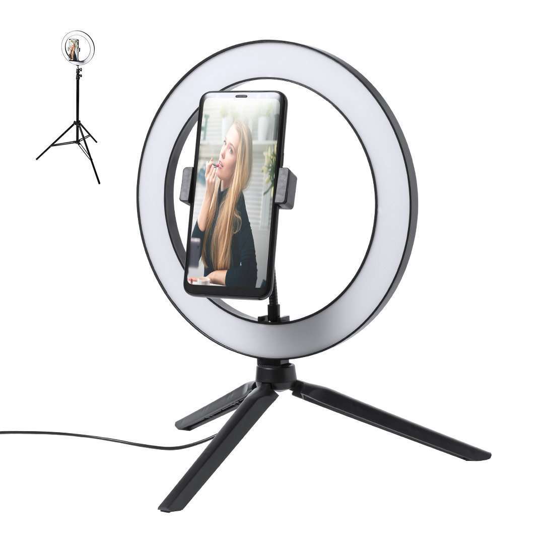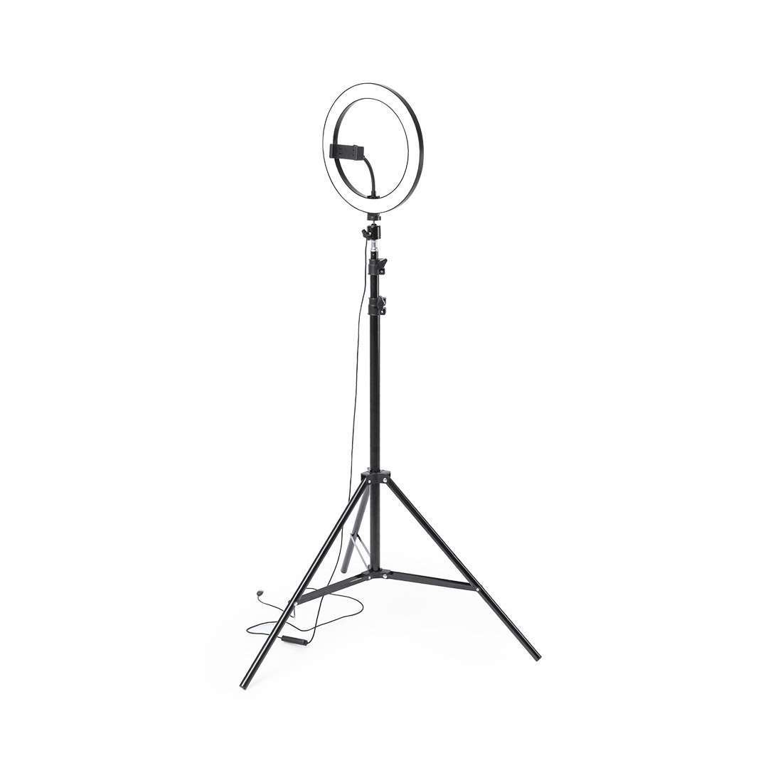 Set de iluminación. Incluye anillo de luz, trípode de mesa, y trípode de suelo con altura regulable hasta 180cm. 120 ledes, con 3 posiciones de iluminación y 10 niveles de intensidad de luz regulable. Alimentación mediante conexión USB. Cable con controlador y disparador remoto incluidos. Presentado en atractiva caja de diseño. Extensible. 120 Ledes. 3…