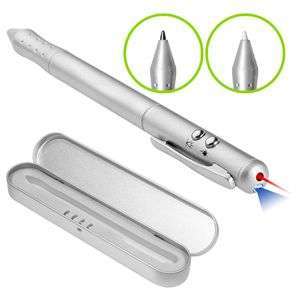 Bolígrafo metálico multi-función 4 en 1. Incluye bolígrafo, linterna LED, puntero láser y puntero PDA (Palm). Presentación en estuche de aluminio. Escritura Azul.