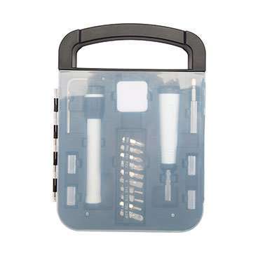 Medida: 22 x 16 x 2,5 cm. Contiene: linterna, cinta metrica, multi desarmador con juego de 10 puntas (4 phillips, 2 planas, 3 hexagonales y 1 adaptador para acople). Acople para llave tubo 7, 8 , 9 y 10 mm y llave allen.