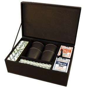 Set Multijuegos en caja grande de PU café moro. Incluye 4 cachos de PU, 20 dados, 2 naipes ingleses y dominó grande.